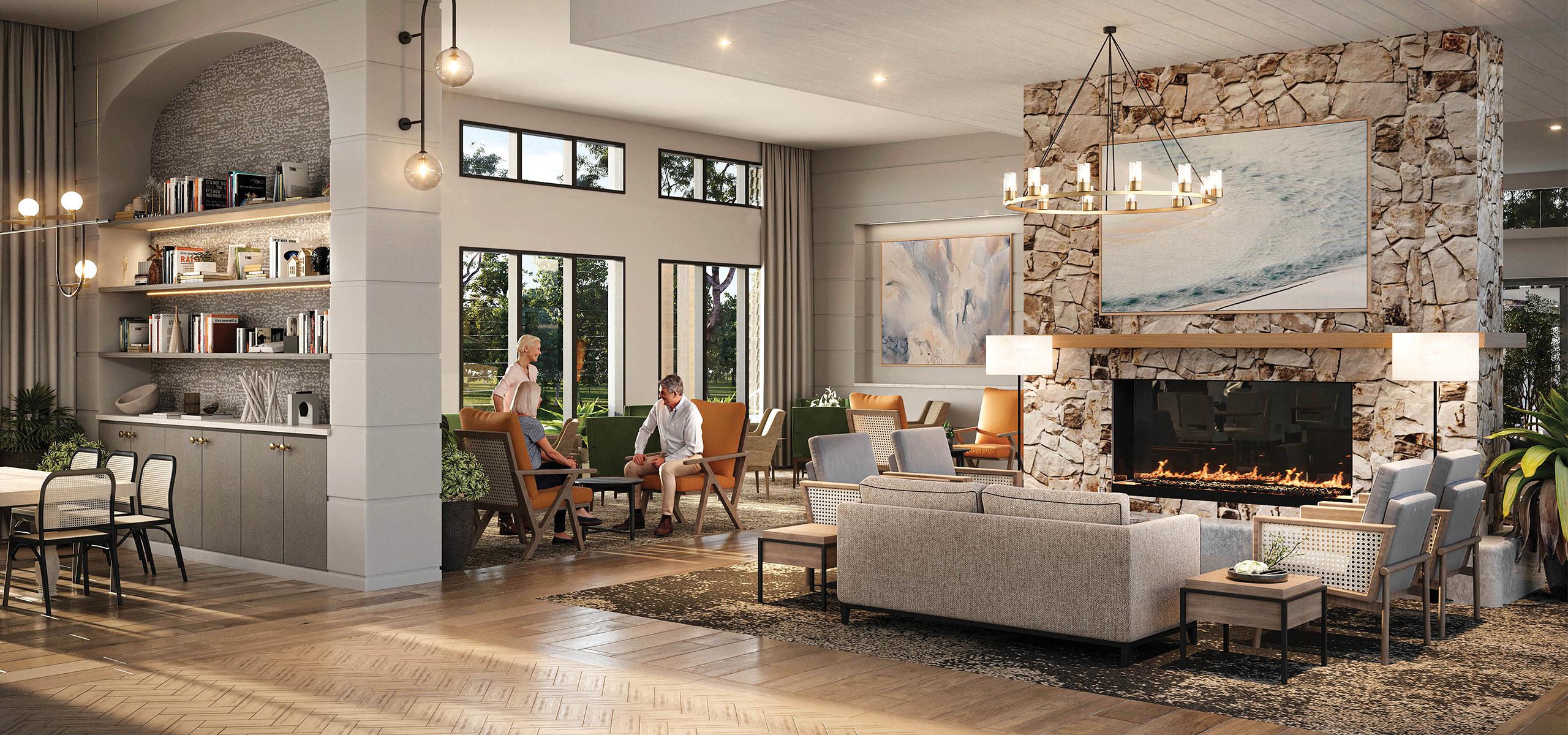 The look is achieved by a mix of cool and warm tones and with the use of timber and warm based cladding stone contrasted against cool grey limestone and textured carpet. Residents can enjoy the many seating areas and in winter stay warm with an indoor fireplace.