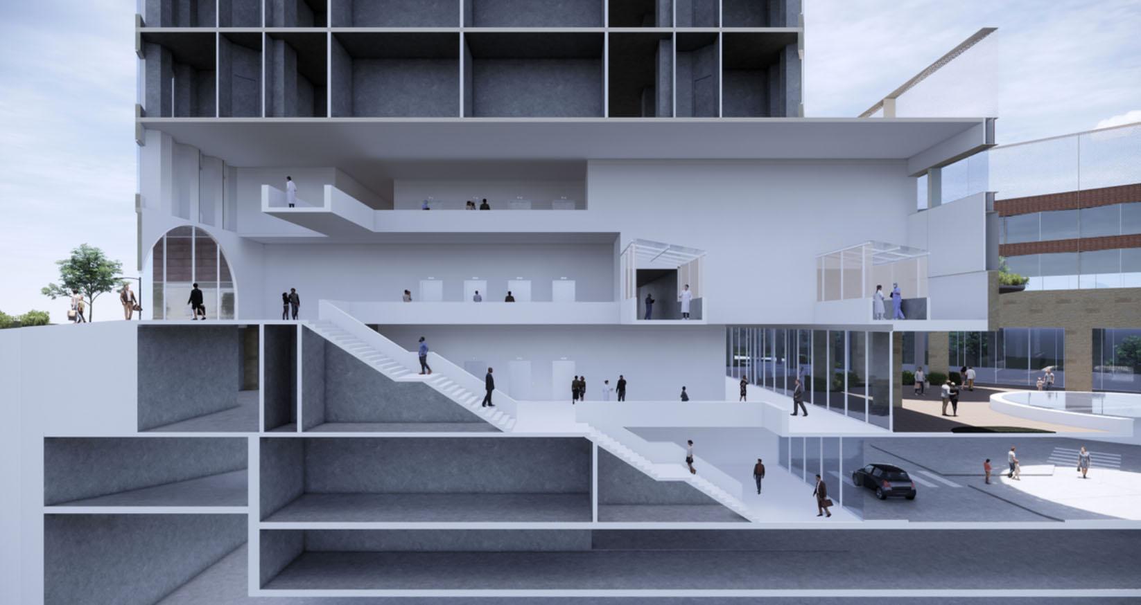 The design prioritizes an active and permeable ground plane, with a triple-height main entrance providing an abundance of natural light and ventilation, improving wayfinding and mitigating the stress of hospital waiting rooms. Green rooftop gardens will also offer outdoor experiences for patients and staff.