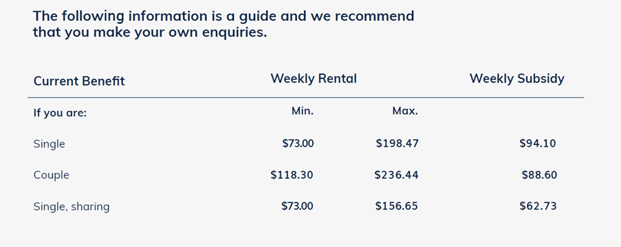 Rental Assistance subsidies may be available through Centrelink to individuals who require financial assistance due to low income and rent in the private market. Please visit centrelink.com.au for further information.
