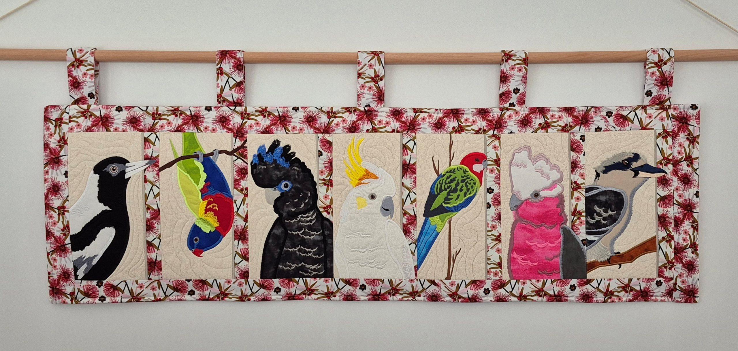 Diane from Oasis submitted an applique machine embroidery of Australian birds. The applique is 130cm wide and 37cm high and took approx. 7 hours to construct with the embroidery taking 179,548 stitches and 187 changes of colour thread. “We have had all these Australian birds visit our family home garden. Now we are at Oasis Redhead with new trees and shrubs we are hoping most of these birds will visit. Some already have,” said Diane. Congratulations Diane!