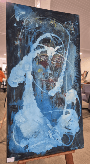 Titled ‘Blue Madonna’ this impressive piece of art has been carefully created using acrylic, enamel, spray paint, and ink on canvas. Dorothea shared her inspiration for this piece is multifaceted and quite personal. “I approach making art from a do it now and work out what it could mean later,” said Dorothea. Congratulations Dorothea!